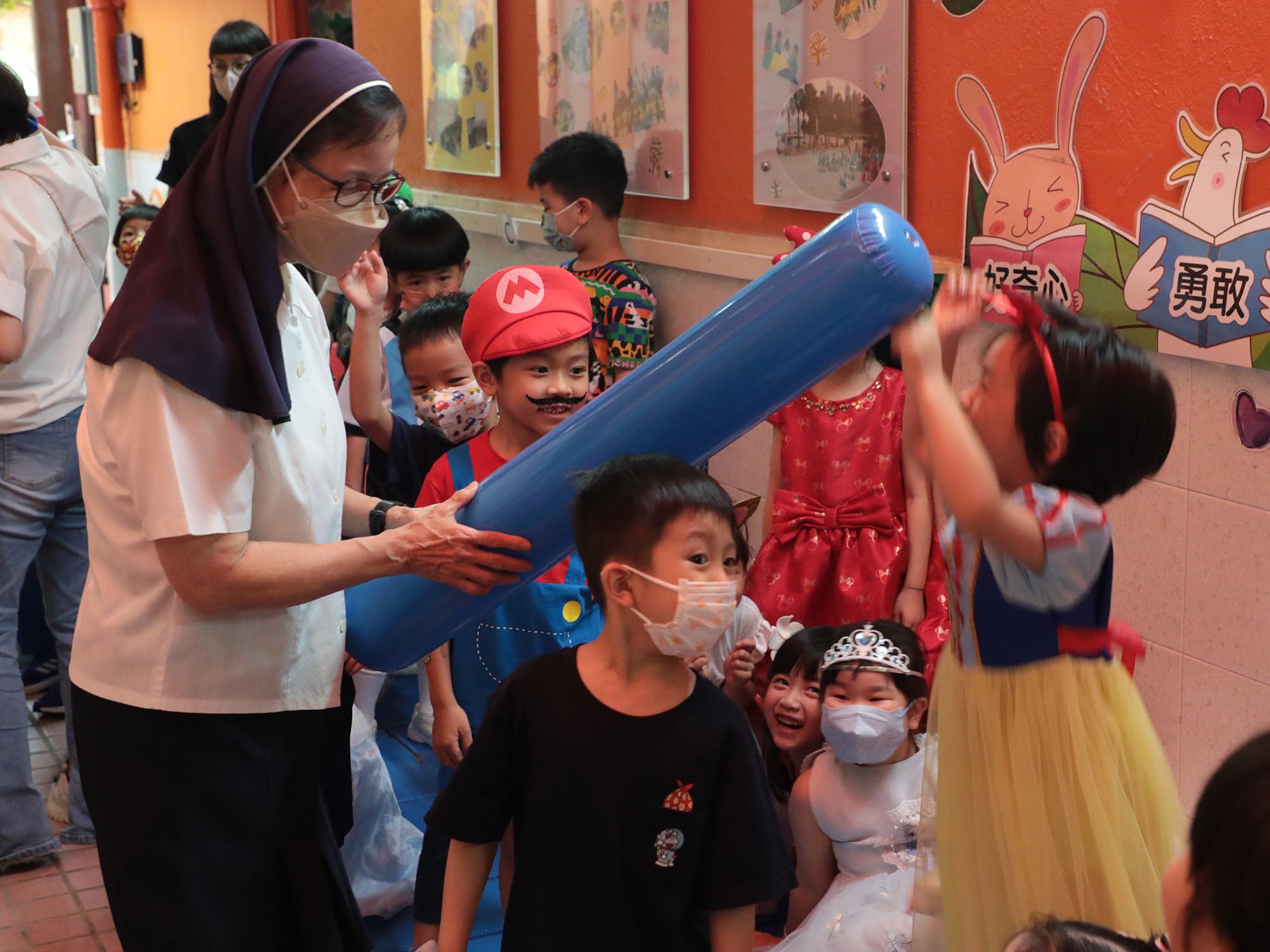 本園於5月22日(星期一)為5、6月生日的小朋友舉行了「卡通人物」生日會。配合活動主題,幼兒變身成為自己喜愛的卡通人物,有優雅的公主王子、勇敢的英雄、可愛的米奇和唐老鴨……造型色彩繽紛,十分可愛!當日進行了一連串精彩的慶祝活動,配合幼兒的卡通人物服飾妝扮,進行卡通人物大追蹤和大風吹遊戲,其中又有卡通人物FASHION SHOW,幼兒玩得十分盡興呢!除了參與不同有趣的遊戲外,幼兒更加發揮創意,製作一個獨一無二的卡通人物吊飾!當天全校的師生更首次進行交換貼紙活動,學習慷慨與人分享,大家也渡過了美好的一天!