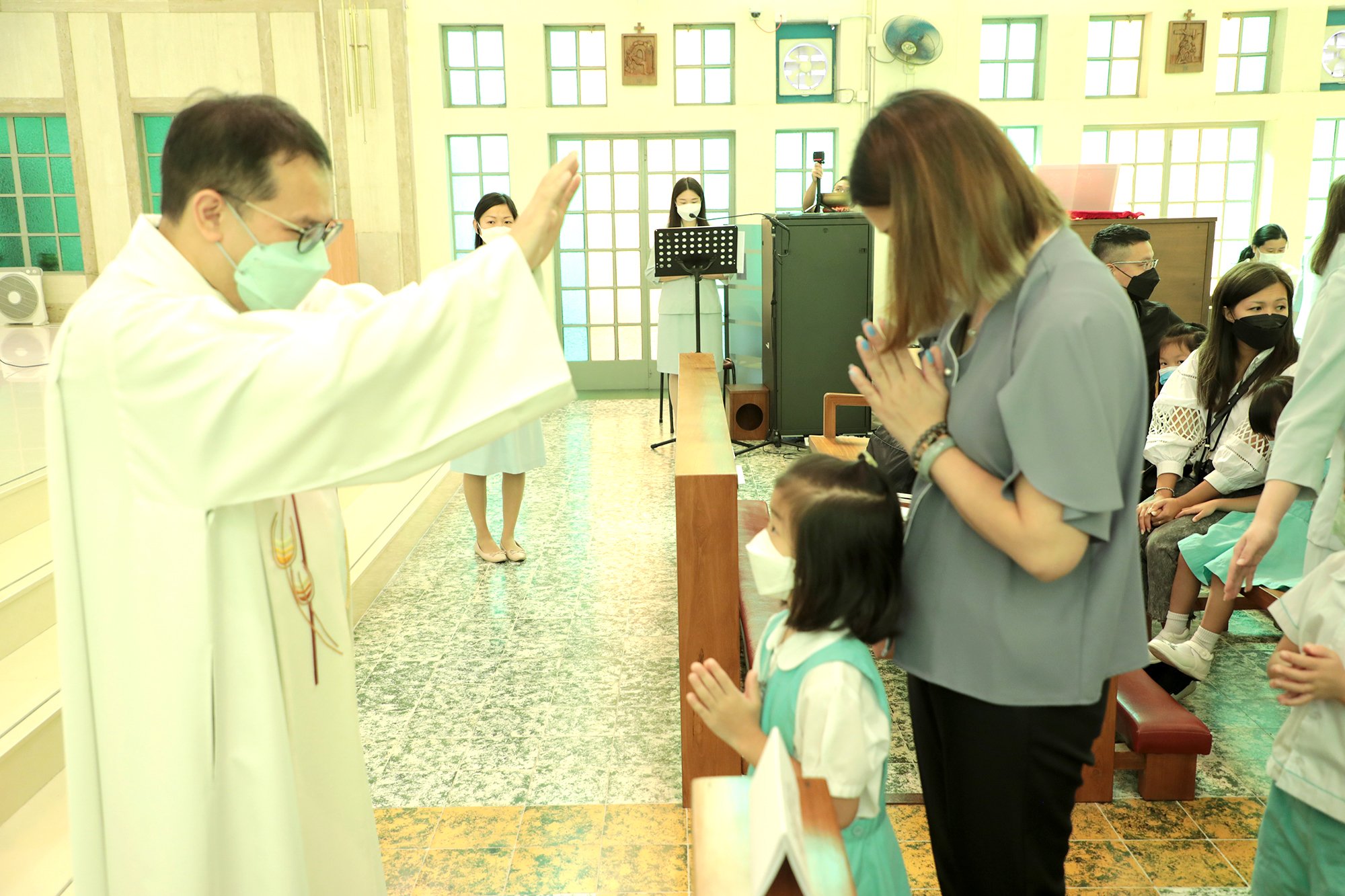 本園於2022年10月8日(星期六)假北角聖猶達堂舉行開學祝福禮,本年度主題為「愛與共融」。我們很榮幸邀請了呂志文神父主持禮儀,呂神父以「愛的使命」帶出我們要懂得感恩,他提問幼兒如果別人幫助你,可以說什麼?,幼兒主動回應「唔該」、「多謝」、「辛苦曬」,呂神父提醒我們這些簡單的說話就是對別人的愛,在學校和家中都可以做到。父母亦應以身作則,多說感恩的話。今年校方組織了家長歌詠團,帶領大家一起以歌聲讚美天主。呂神父更為全校的師生及家長覆手祝福,讓大家懷著主賜的平安與喜樂迎接新學年。
