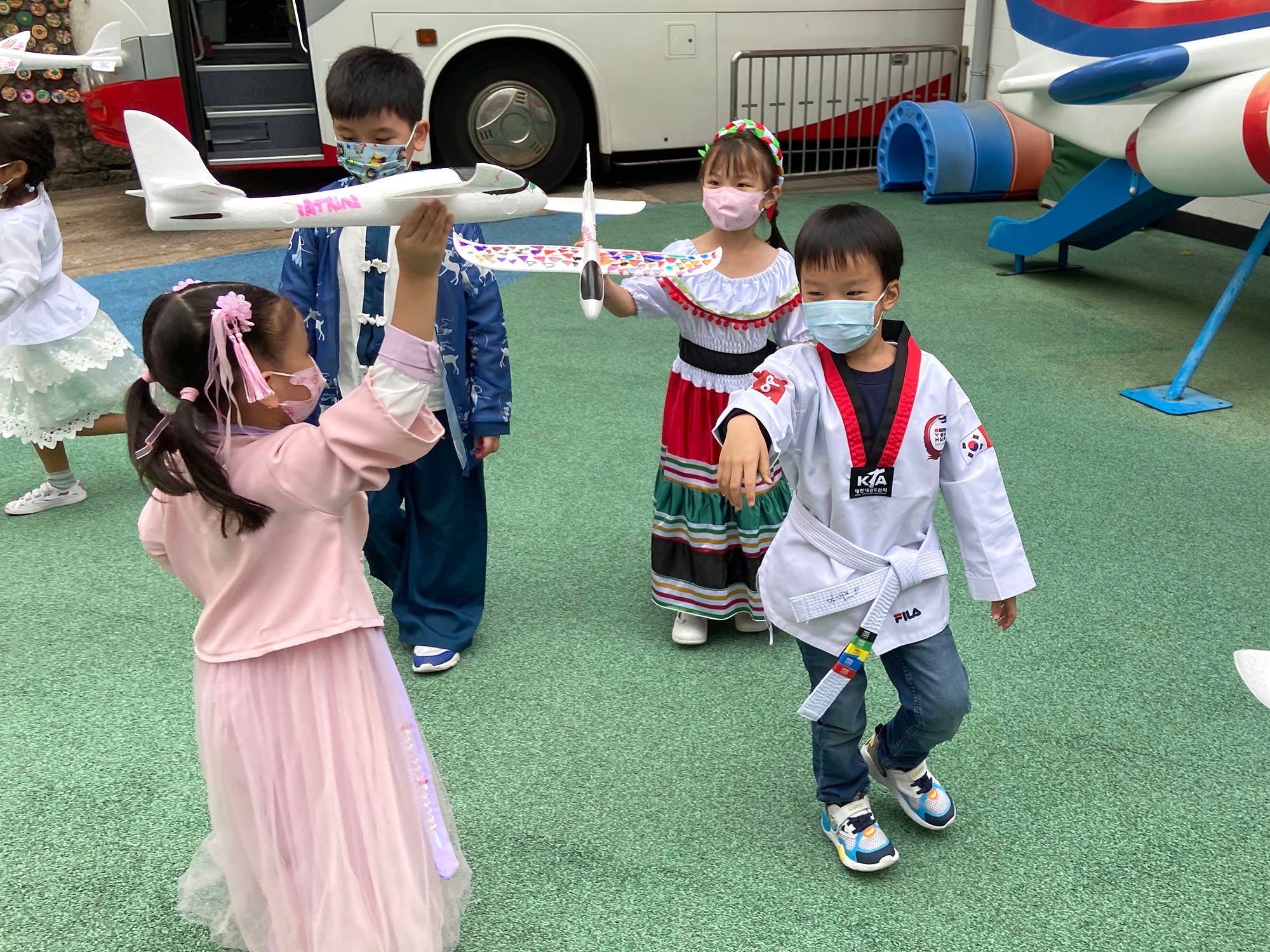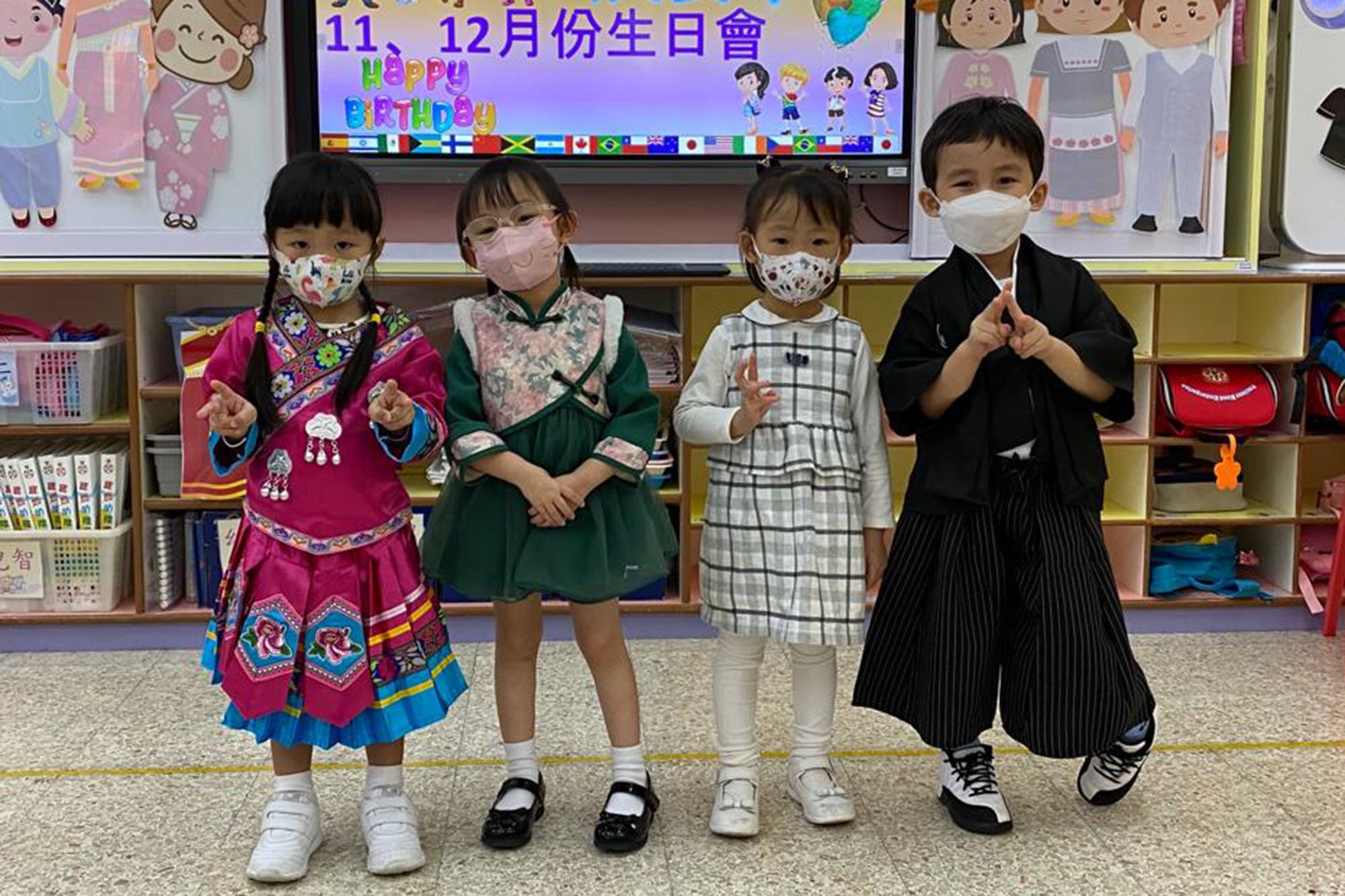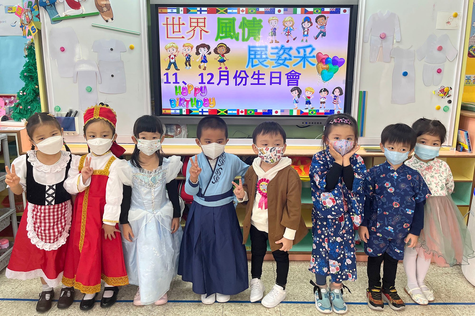 本園於2022年11月30日(星期三)舉行了「世界風情展姿釆 」生日會,幼兒們都悉心打扮,穿著了不同國家的服飾回校參與活動,一同為11月及12月份生日的小朋友慶祝生日!當天幼兒不但認識了不同國家的傳統服裝和文化特色,更拿著名信片到處搜集世界各地的名勝貼紙,在不同國家的名勝背景前與老師拍照留念,十分熱鬧!此外,幼兒們亦挑戰了非洲連步舞,以及設計了一架獨一無二的小飛機,帶到操埸一起試飛「衝上雲霄」,幼兒都感到相當難忘呢!
