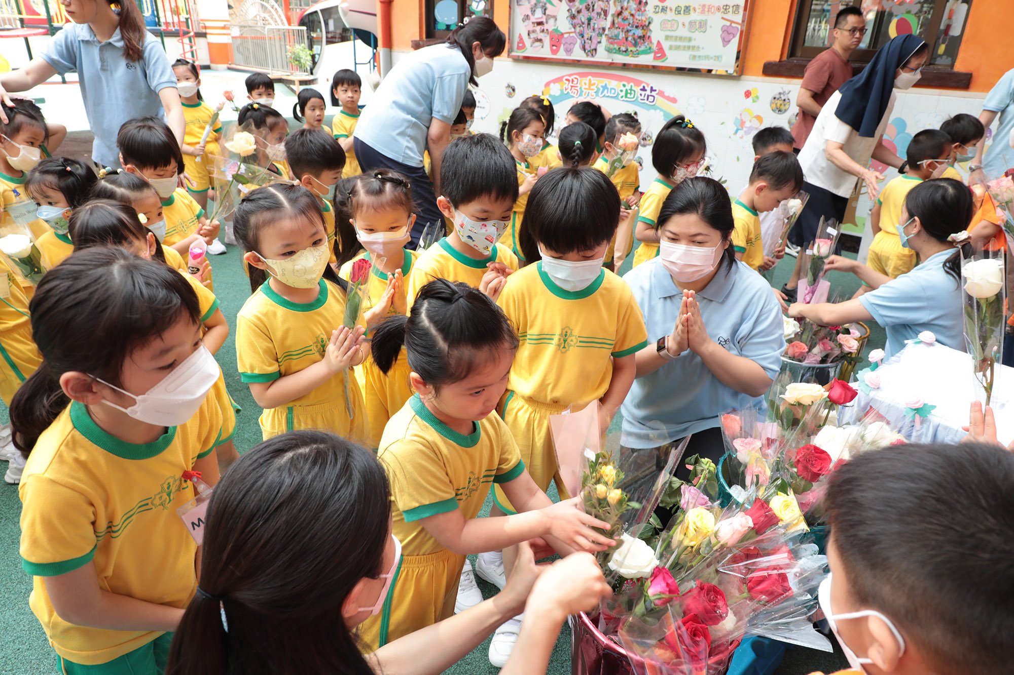 本校於五月二十九日(星期一)教會之母榮福童貞瑪利亞的紀念日,我們舉行了聖母月敬禮活動-聖母巡遊,以歌頌耶穌基督降生成人,救贖我們。首先由甘修女及基督小幼苗代表領路,護送著聖母像,全校師生跟隨聖母座駕前進到操場,沿途一同祈禱及詠唱「法地瑪聖母」、「聖母心裏愛孩子」、「中華聖母」感謝和讚頌聖母。其後,一同頌唸聖母經,幼兒為感謝聖母時時的陪伴,更送上心心和飛吻,在聖母像前獻上鮮花,藉此表達對聖母的孝愛。