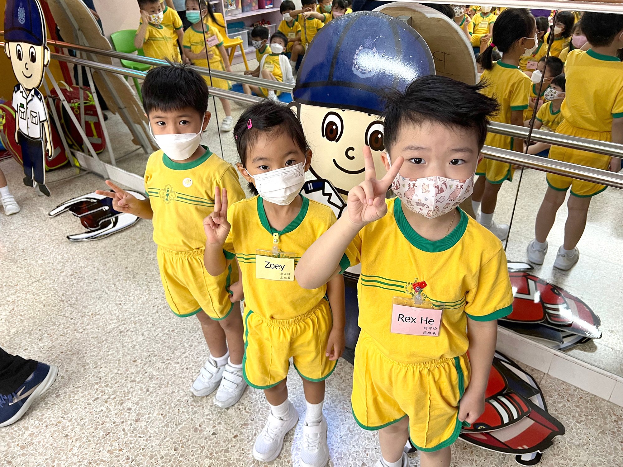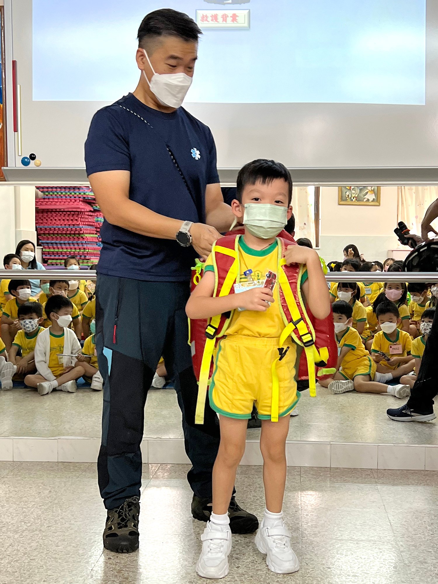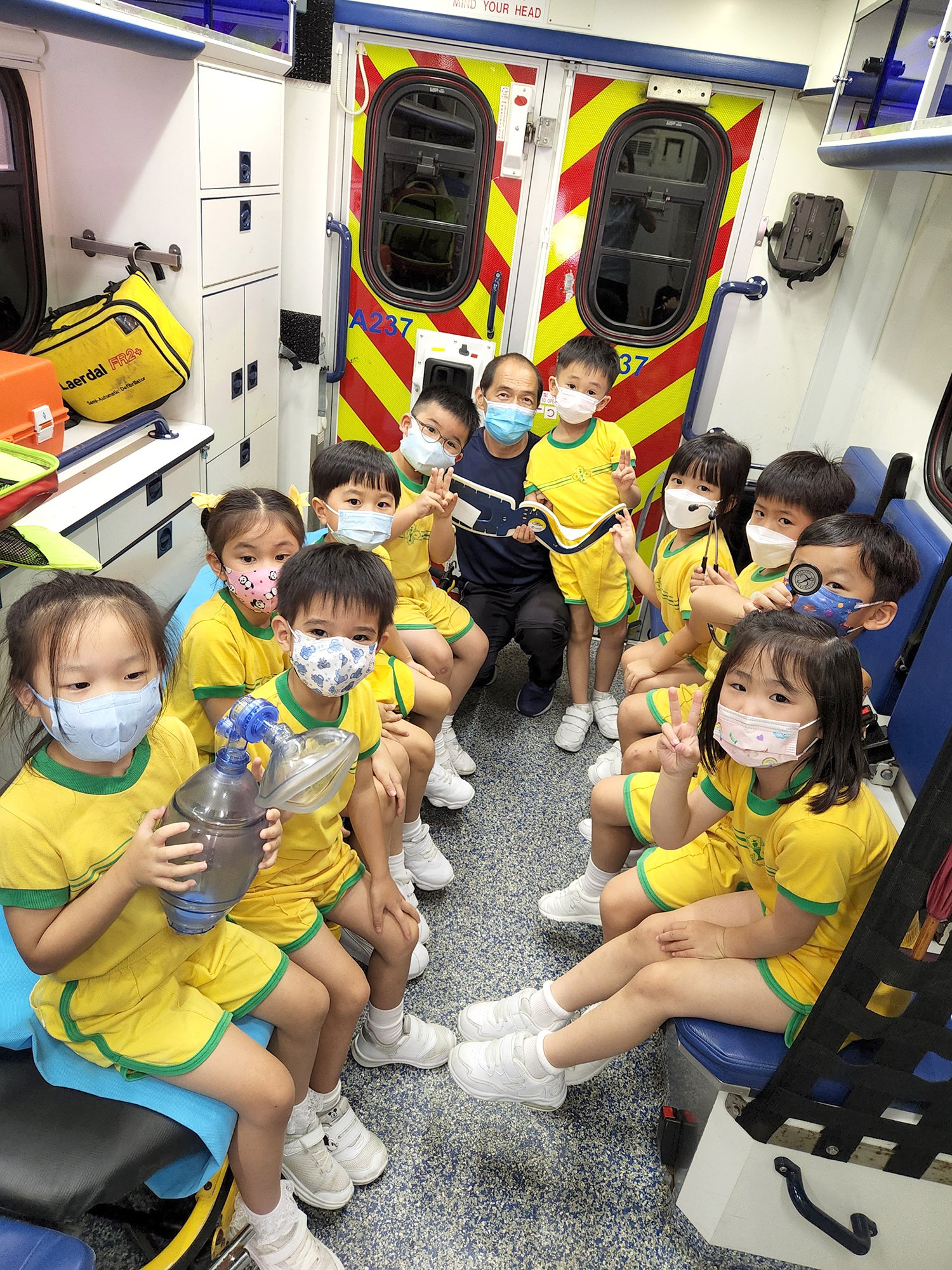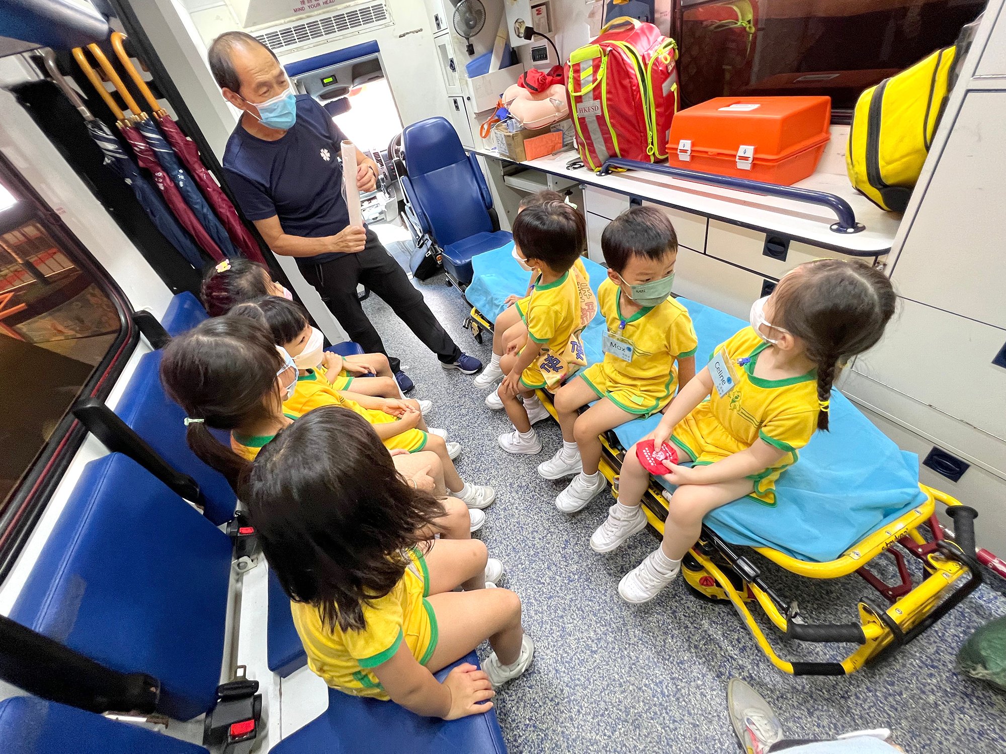 為配合主題講述不同的職業,本園於9月26日為高班舉行救護服務講座,當天由消防處救護員講解救護員的工作外,他們亦展示了不同職務的救護員的制服及說明用途,還安排救護車讓幼兒能親身參觀,了解救護車內的設備及救護員在車上的工作。最後更讓幼兒穿上兒童版的救護制服,讓他們一嘗當救護員的滋味。整個過程中,救護員生動有趣的講解,加上有奬問答環節,幼兒相當投入,還懂得懷著感恩的心感激救護員辛勞工作,保障市民的生命安全。