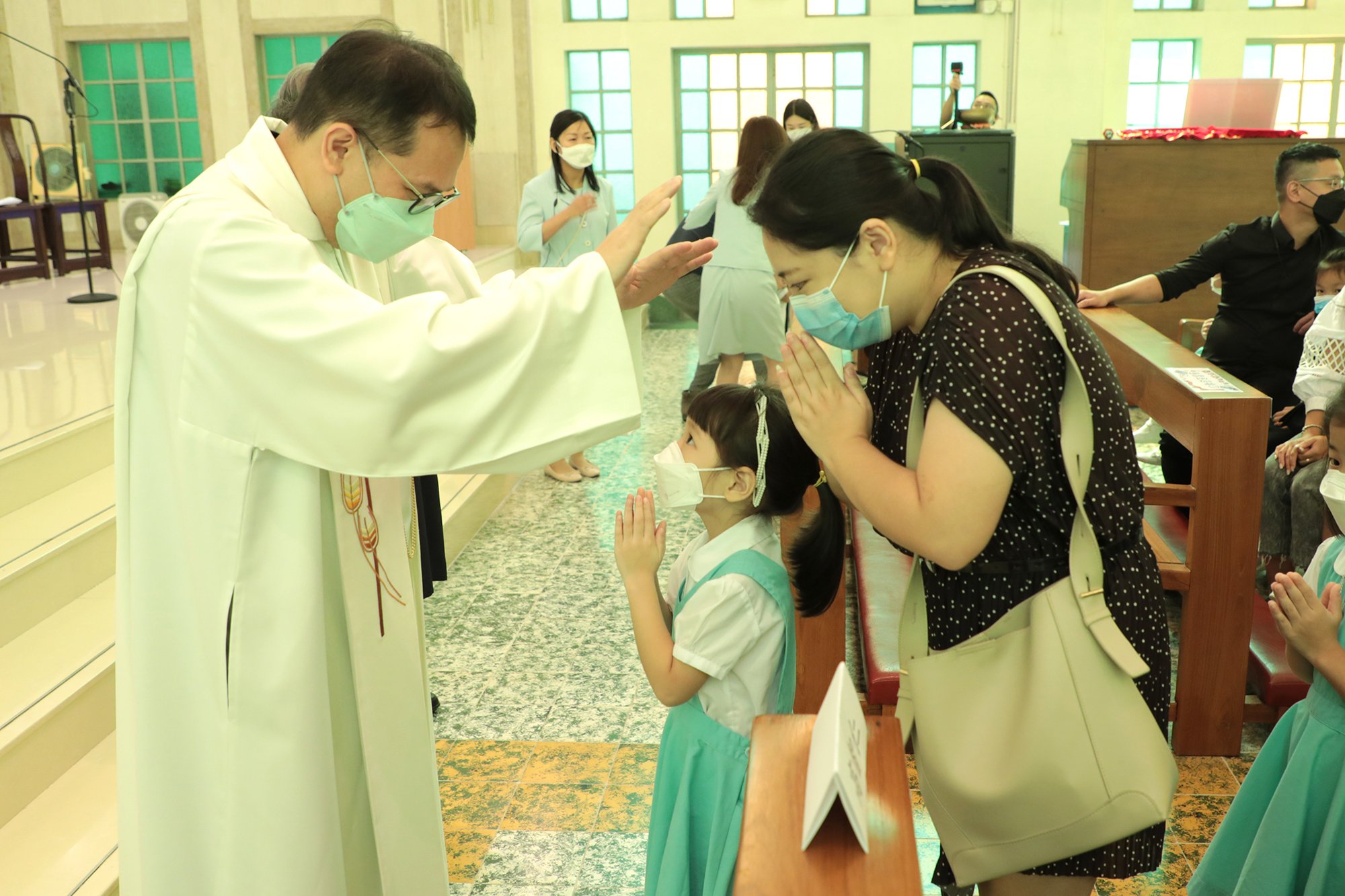 本園於2022年10月8日(星期六)假北角聖猶達堂舉行開學祝福禮,本年度主題為「愛與共融」。我們很榮幸邀請了呂志文神父主持禮儀,呂神父以「愛的使命」帶出我們要懂得感恩,他提問幼兒如果別人幫助你,可以說什麼?,幼兒主動回應「唔該」、「多謝」、「辛苦曬」,呂神父提醒我們這些簡單的說話就是對別人的愛,在學校和家中都可以做到。父母亦應以身作則,多說感恩的話。今年校方組織了家長歌詠團,帶領大家一起以歌聲讚美天主。呂神父更為全校的師生及家長覆手祝福,讓大家懷著主賜的平安與喜樂迎接新學年。